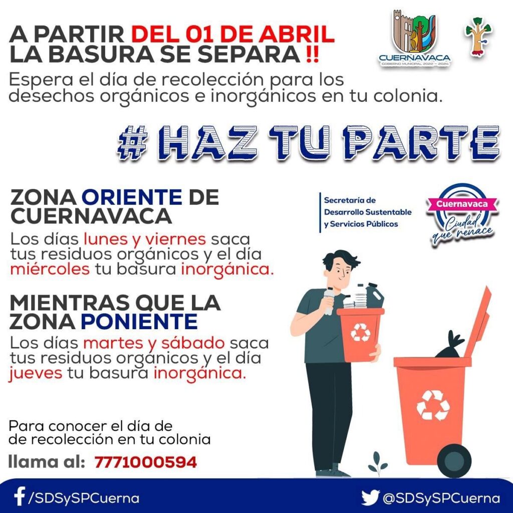 Para conocer el día de recolección en tu colonia puede consultar las redes sociales oficiales del Municipio de Cuernavaca y de la Secretaría de Desarrollo Sustentable y Servicios Públicos del Ayuntamiento.