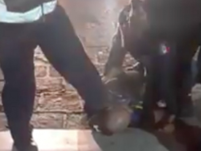 Mientras se suma otra oficial y le pega puñetazos en el rostro al ciudadano.