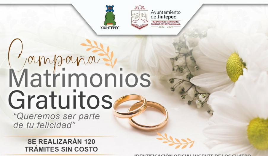 Con la finalidad de dar certeza legal a la unión de dos personas, el Gobierno con Rostro Humano de Jiutepec COMUNICA a la población sobre la campaña de matrimonios gratuitos.