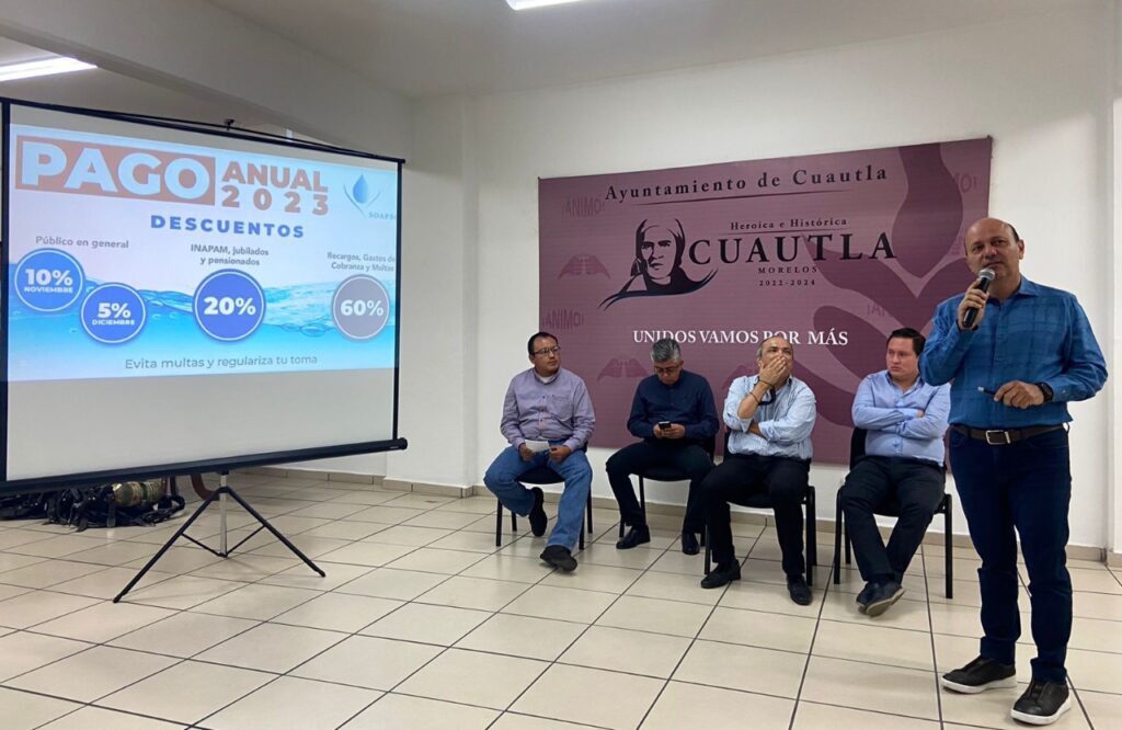 El Presidente Municipal, Rodrigo Arredondo, invitó a la población a regularizar sus tomas de agua a fin de evitar multas y anunció la campaña de descuentos que realiza el Sistema Operador de Agua Potable y Saneamiento de Cuautla (SOAPSC) en el pago anual 2023.