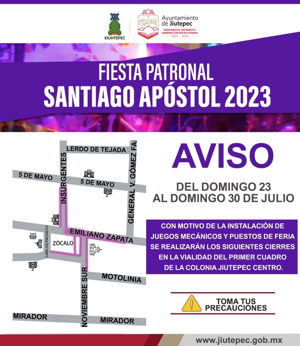1.-Con motivo de la fiesta patronal de Santiago Apóstol, a realizarse entre el sábado 22 y el domingo 30 de julio del presente año, diferentes vialidades de la colonia Centro se mantendrán cerradas a la circulación vial, por lo cual la administración municipal solicita a los habitantes del centro de población, así como a quienes circulan regularmente por la zona a tomar sus previsiones de tiempo.