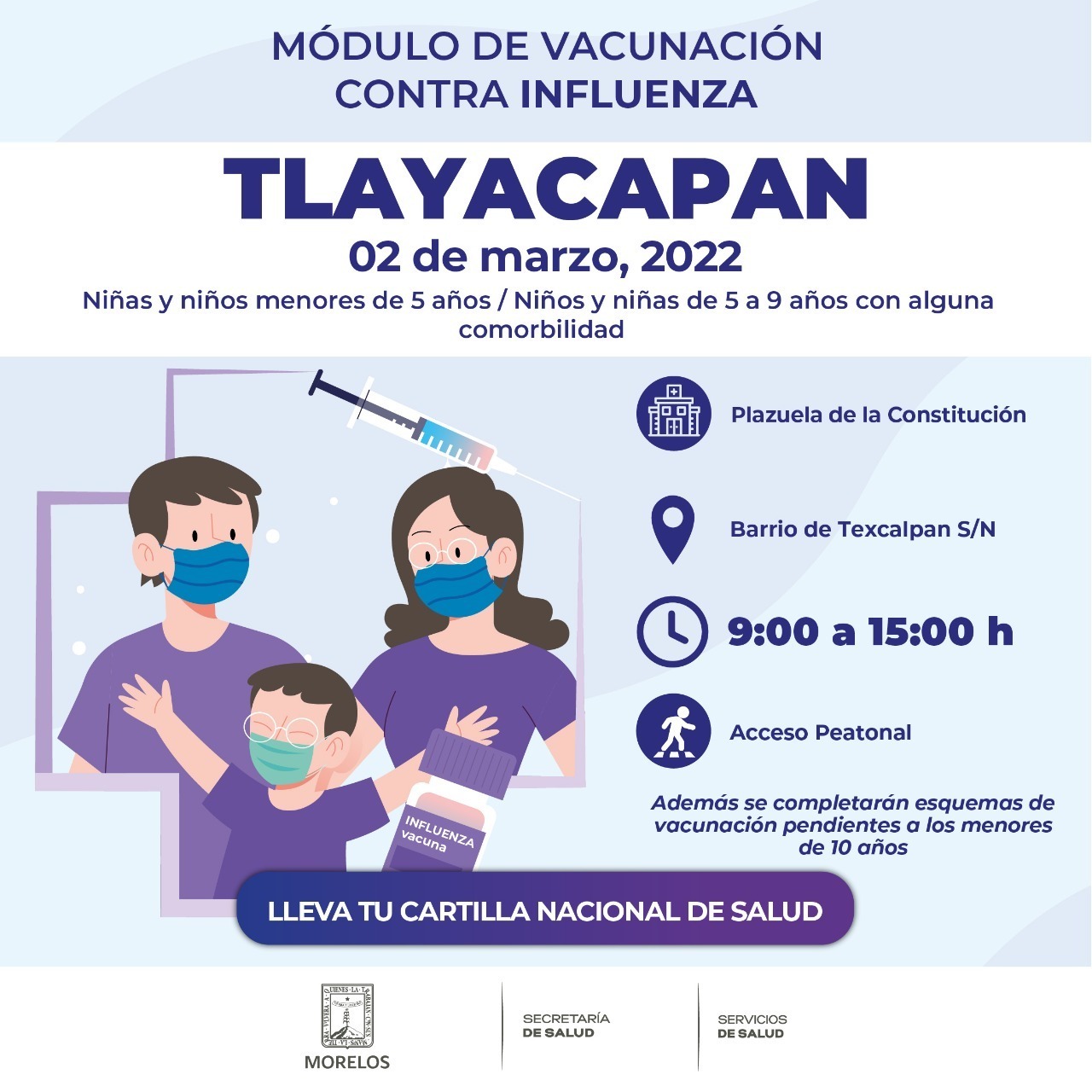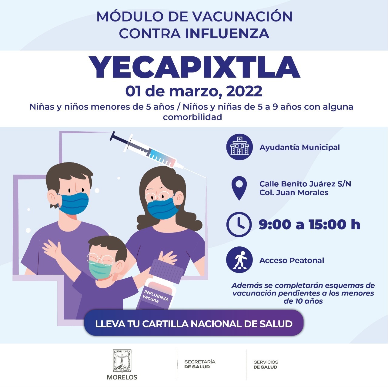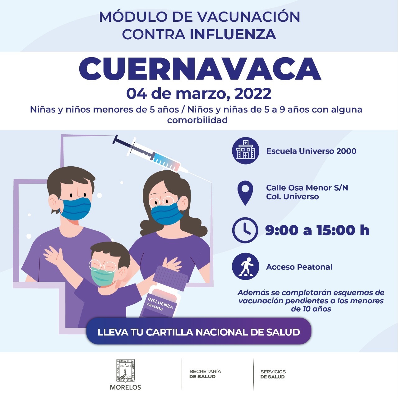 El Gobierno de Morelos a través de la Secretaría de Salud y Servicios de Salud de Morelos (SSM), invitó a los padres de familia y/o tutores a completar el esquema de vacunación de los menores de edad para protegerlos de diversas enfermedades como la influenza.