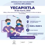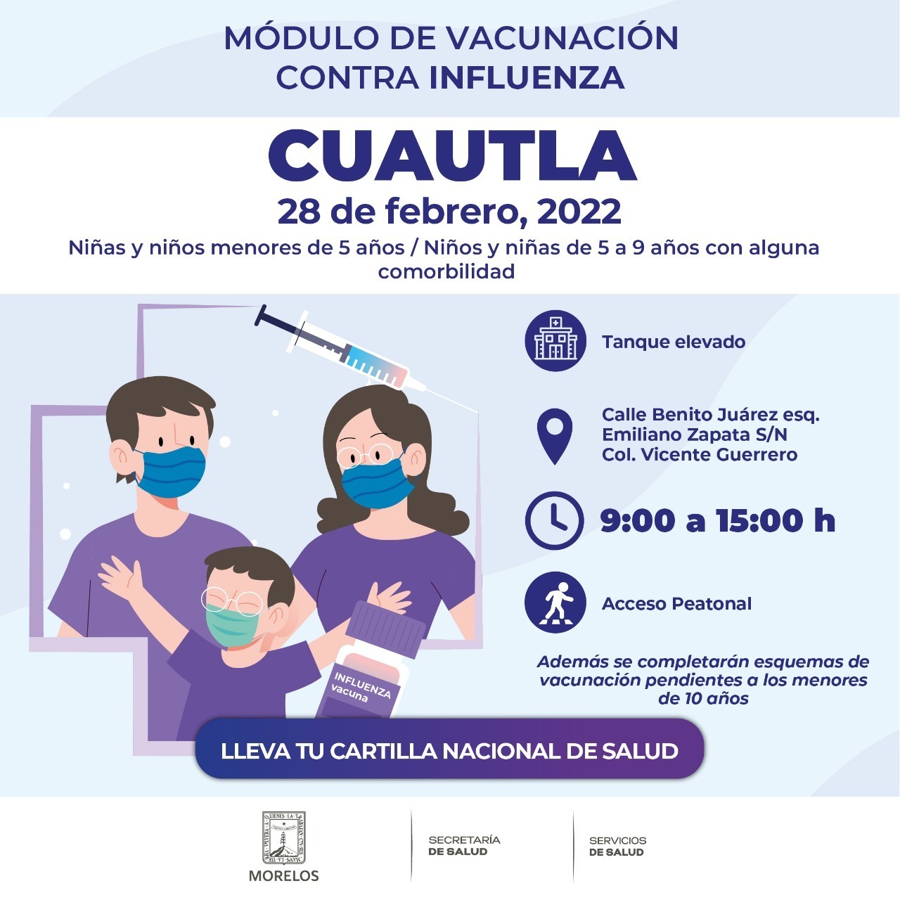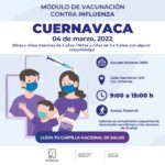 Yedid Miranda Campos, jefa del Departamento de Atención a la Salud de la Infancia y la Adolescencia (DASIA) de SSM, detalló que este lunes 28 de febrero, se instalará el módulo de vacunación en el tanque elevado, ubicado en calle Benito Juárez, esquina Emiliano Zapata, colonia Vicente Guerrero, en Peña Flores, localidad de Cuautla; el 01 de marzo, las brigadas inmunizarán contra influenza en la Ayudantía Municipal, calle Benito Juárez, sin número, colonia Juan Morales en Yecapixtla.