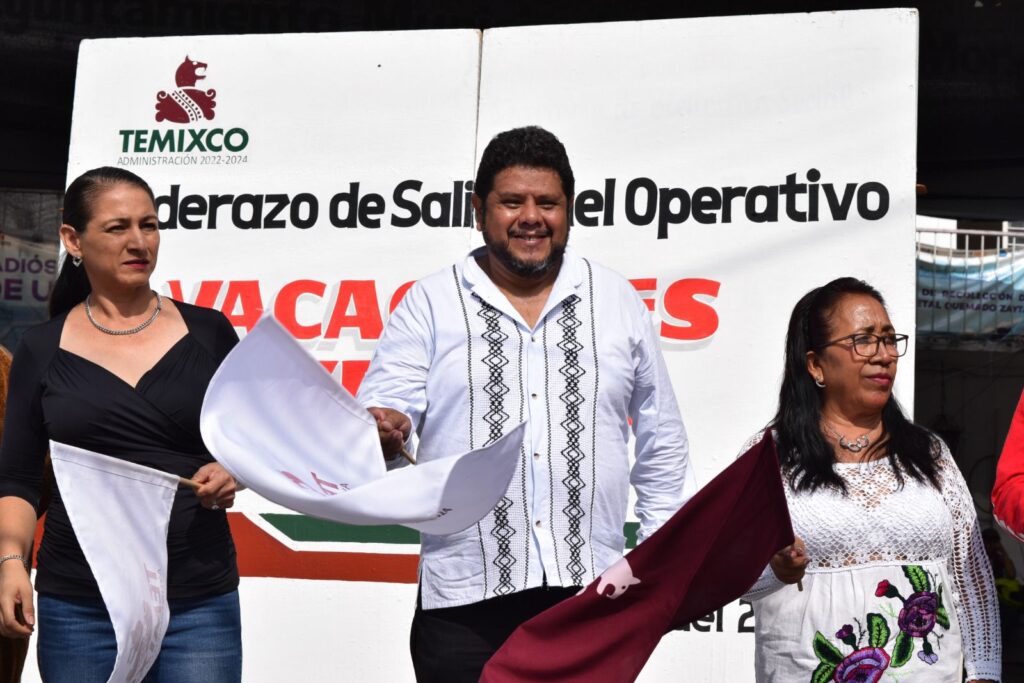 Esta mañana en representación de la presidenta municipal del Ayuntamiento de Temixco Juanita Ocampo Domínguez, el secretario general Carlos Caltenco Serrano en compañía del titular de la Secretaría Ejecutiva, Administrativa y de Protección Ciudadana Capitán en Retiro Rubén Sánchez Rivera y la Directora de Turismo Jennifer Vanessa López Vázquez encabezaron el banderazo oficial del operativo especial con motivo de este periodo vacacional.