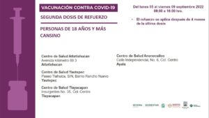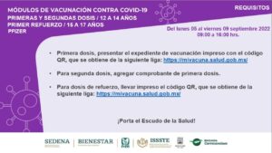 Autoridades sanitarias federales y estatales informaron que, del lunes 05 al viernes 09 de septiembre 2022, continúa activa la vacunación contra COVID-19 en unidades médicas, donde se aplicarán primeras y segundas dosis para adolescentes de 12 a 14 años con Pfizer; primer refuerzo de Pfizer para el sector de 15 a 17 años; así como, segunda dosis de refuerzo con Cansino a personas de 18 años y más.