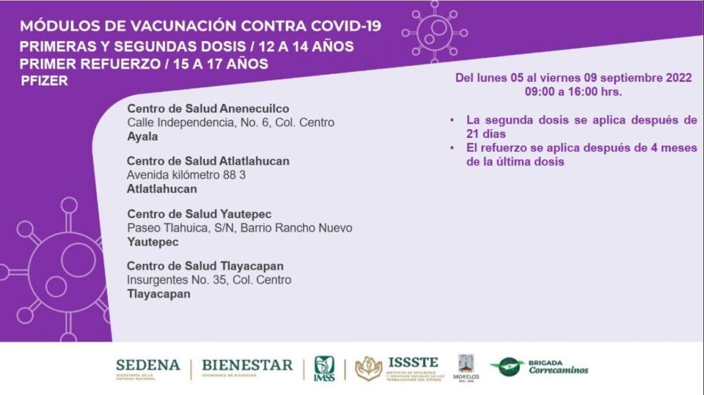 Autoridades sanitarias federales y estatales informaron que, del lunes 05 al viernes 09 de septiembre 2022, continúa activa la vacunación contra COVID-19 en unidades médicas, donde se aplicarán primeras y segundas dosis para adolescentes de 12 a 14 años con Pfizer; primer refuerzo de Pfizer para el sector de 15 a 17 años; así como, segunda dosis de refuerzo con Cansino a personas de 18 años y más.