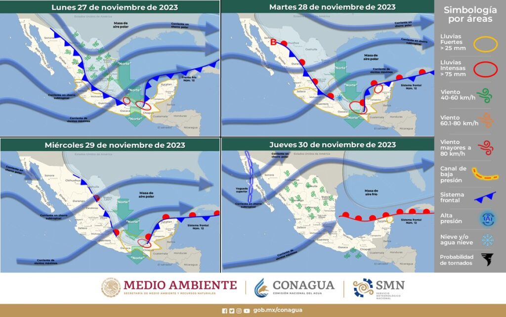 Se mantendrán prácticamente las mismas condiciones atmosféricas dominantes en el territorio nacional durante los días previos, con los efectos del Sistema Frontal no. 12 y disponibilidad de humedad, generando tiempo lluvioso en estados del oriente y mitad sur del país.