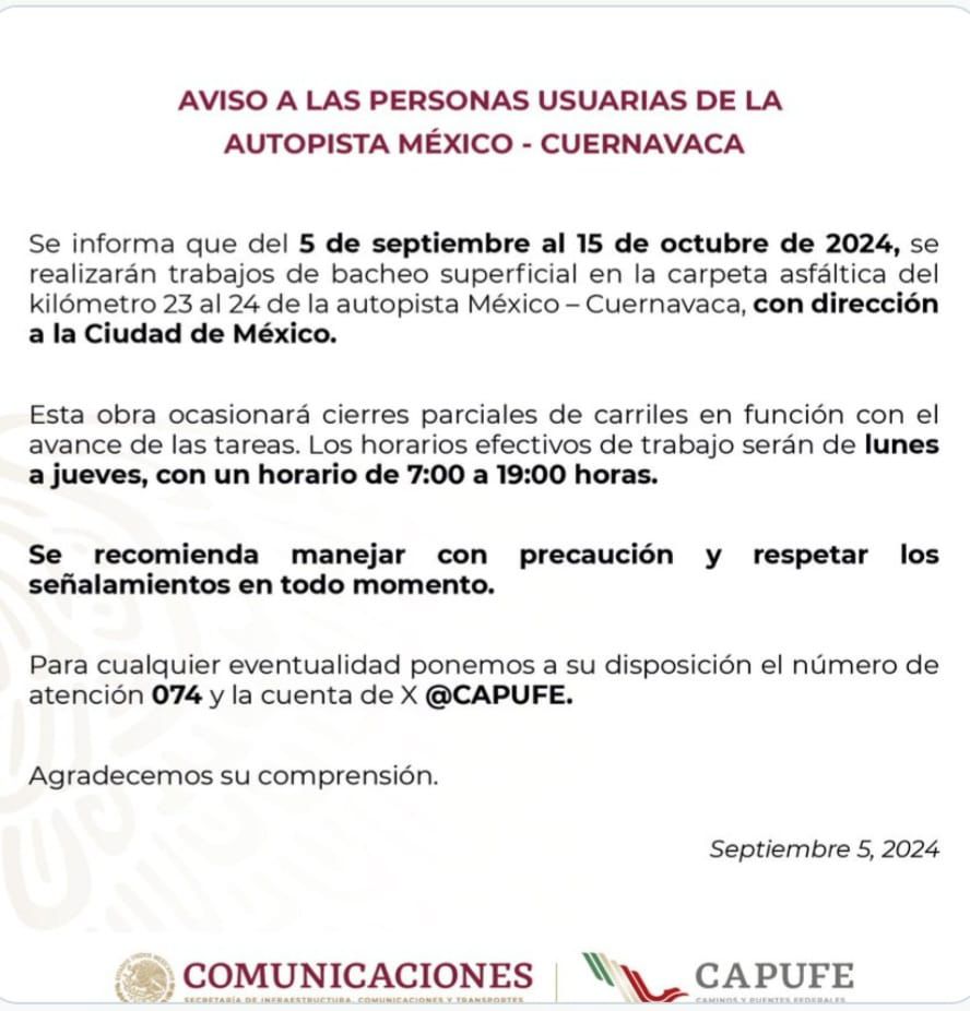 Se informa que del 5 de septiembre al 15 de octubre de 2024, se realizarán trabajos de bacheo superficial en la carpeta asfáltica del kilómetro 23 al 24 de la autopista México – Cuernavaca, con dirección a la Ciudad de México.