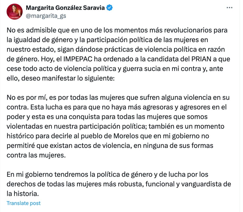 La candidata a la gubernatura de Morelos, Margarita González Saravia, se manifestó en sus redes sociales que es inadmisible que en uno de los momentos más revolucionarios para la igualdad de género y la participación política de las mujeres en el estado, sigan dándose prácticas de violencia política en razón de género.