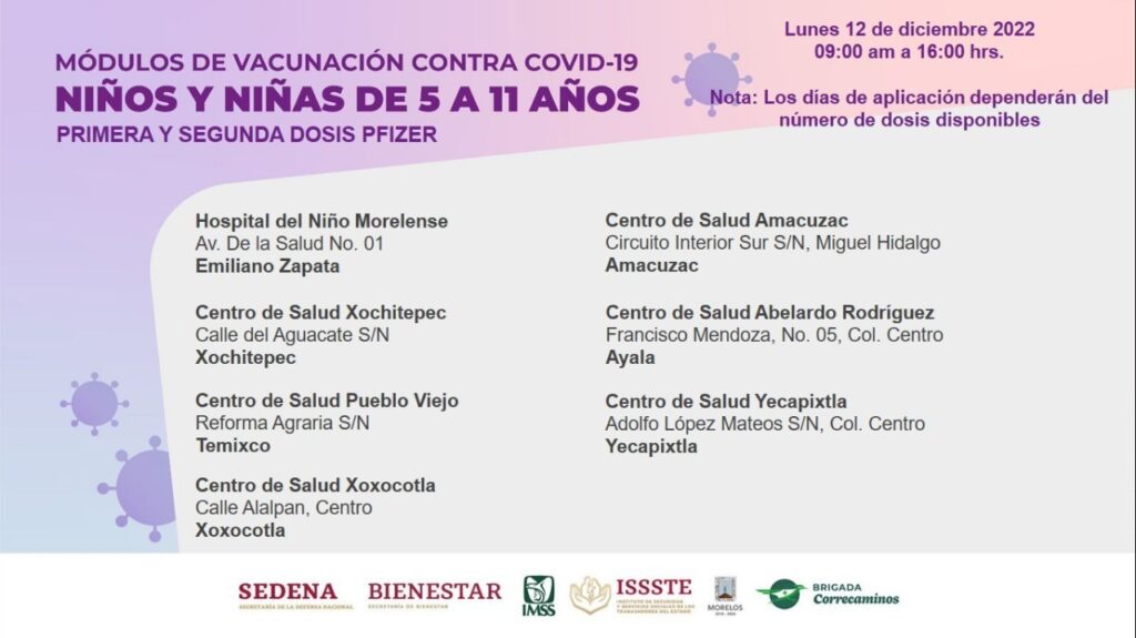 Autoridades federales y estatales invitaron a padres de familia a vacunar contra COVID-19 a niñas y niños de 5 a 11 años de edad, en los puntos activos este lunes 12 de diciembre del 2022, en un horario de 09:00 a 16:00 horas.