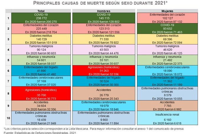 Los datos revelados por el INEGI indican que en el año 2021 murieron 238 mil 772 mexicanos por covid-19, enfermedad que afectó más a los hombres, con 145 mil 115 defunciones, y las restantes 93 mil 652 fueron decesos de mujeres.