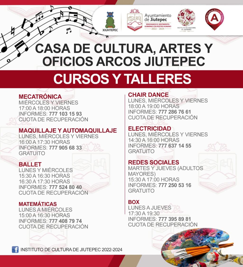 La población interesada en asistir a alguno de las sesiones de los cursos y talleres, los cuales se imparten en turnos matutino y vespertino, puede acudir directamente a las instalaciones de la Casa de Cultura, Artes y Oficios «Arcos» o comunicarse al número de teléfono: 777-399-36-68.