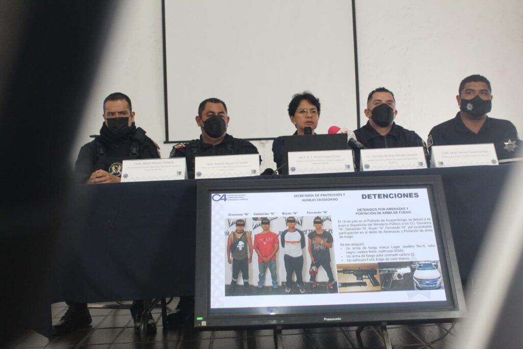 En rueda de prensa semanal, la titular de SEPRAC, Alicia Vázquez Luna, recordó que el pasado 19 de julio se dio a conocer que a través de los operativos Plan Centinela, Circuito Ligero y Vial, se llevó a cabo la detención de cuatro hombres que responden a los nombres de Fernando «N», Sebastián «N», Giovanni «N» y Bryan «N», quienes de acuerdo a denuncias ciudadanas, presuntamente han dañado el patrimonio y tranquilidad de los habitantes del poblado de Acapantzingo, donde amagaron a un vecino con un arma de fuego para despojarlo de su vehículo.