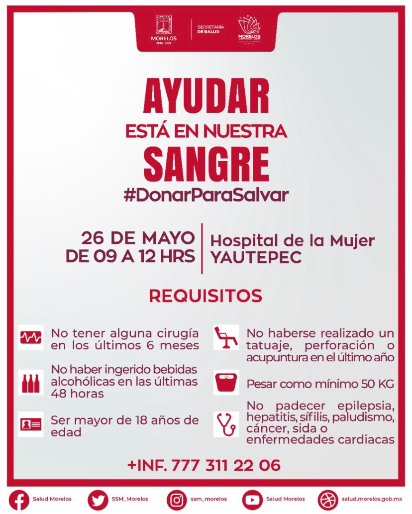 Servicios de Salud de Morelos (SSM), a través del Centro Estatal de Transfusión Sanguínea (CETS), invitó a la población a sumarse este 26 de mayo a la campaña “Ayudar está en nuestra sangre”, en el Hospital de la Mujer en Yautepec.