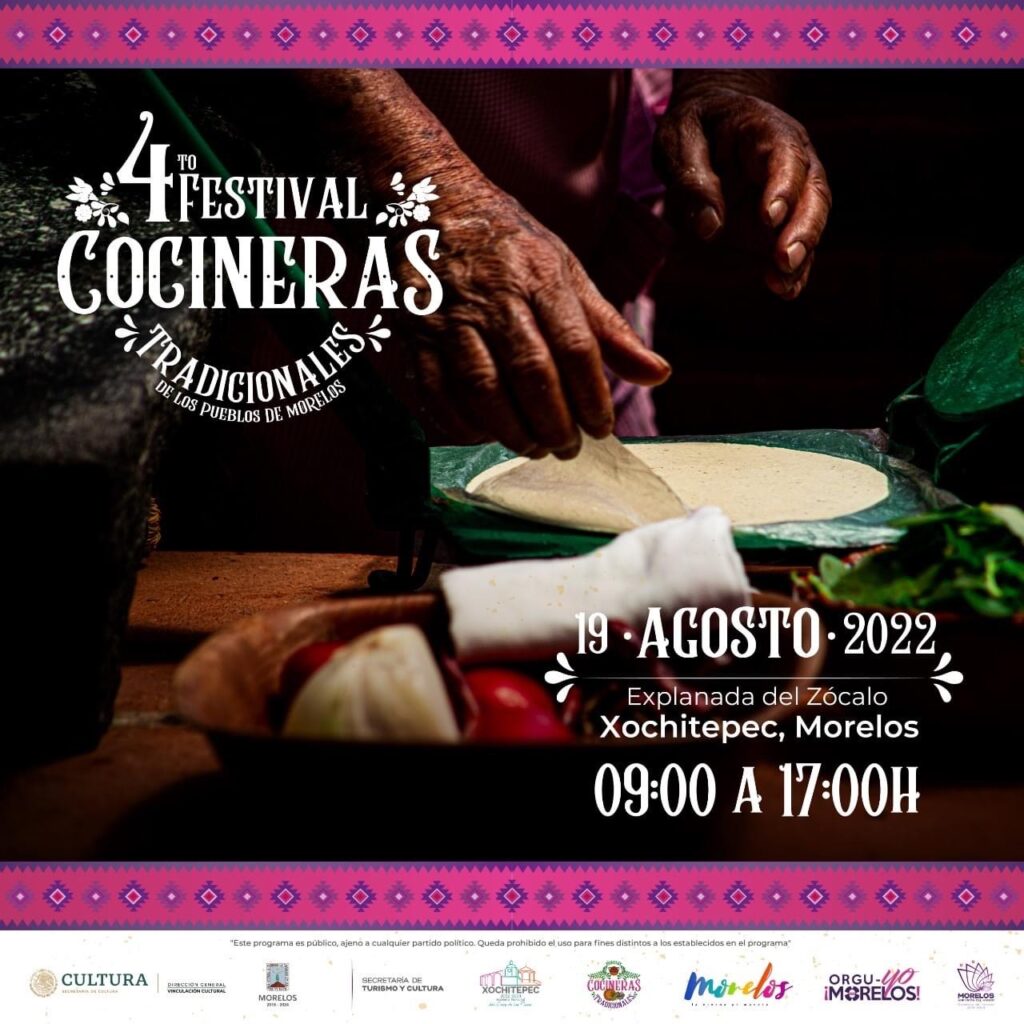 Como parte de los trabajos de promoción, preservación e impulso de la cocina tradicional morelense, la Secretaría de Turismo y Cultura (STyC) invita a turistas, visitantes y población en general asistir al Cuarto Encuentro de Cocineras Tradicionales que se realizará el viernes 19 de agosto de 09:00 a 17:00 horas en la explanada principal del municipio de Xochitepec.