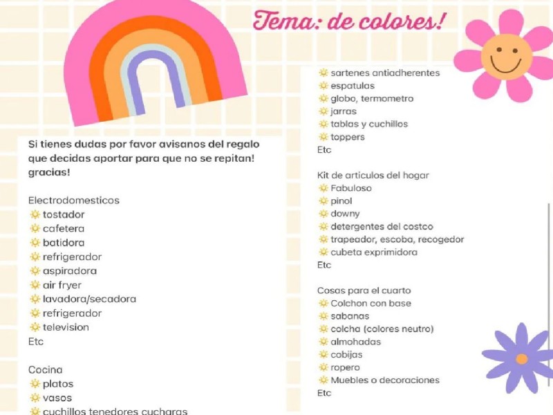 En la colorida invitación la joven pide desde refrigeradores y televisión hasta batidora, platos, sartenes, colchón con base y ropero.