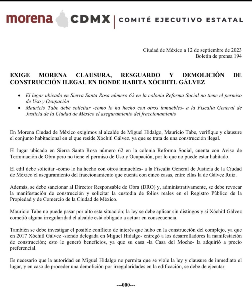 Morena exigió al alcalde de Miguel Hidalgo, Mauricio Tabe, verificar y clausurar el conjunto habitacional en el que reside Xóchitl Gálvez, pues lo calificaron como «construcción ilegal».