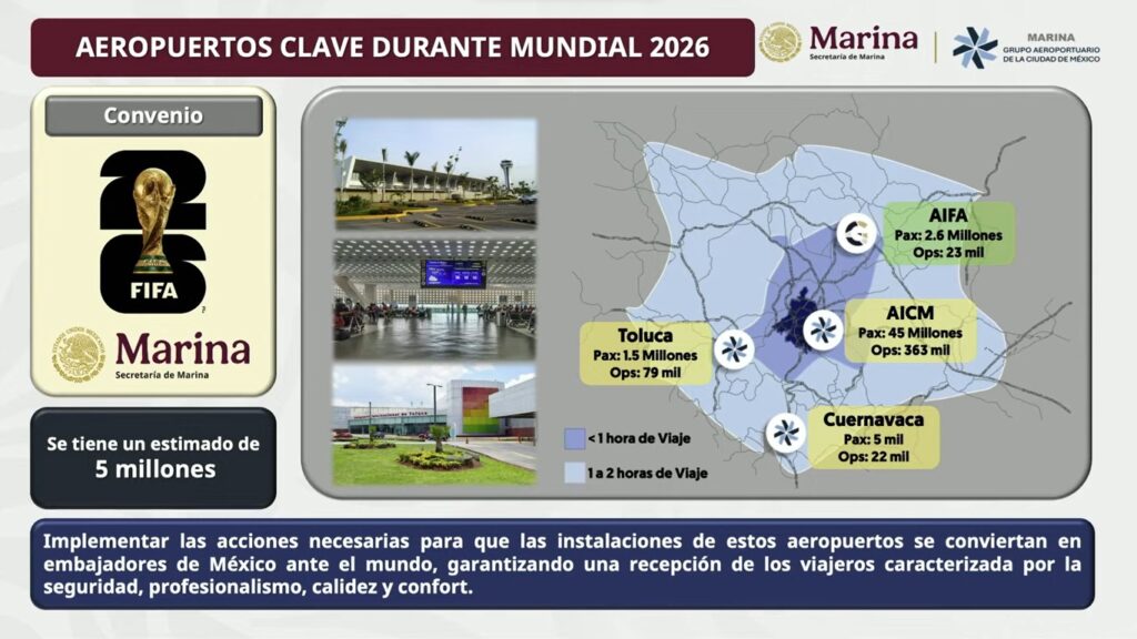 Se detalló que el AICM y el AIFA serán los principales puntos de entrada para los aficionados internacionales, mientras que los aeropuertos de Toluca y Cuernavaca desempeñarán un rol complementario, descongestionando el tráfico aéreo en el centro del país.