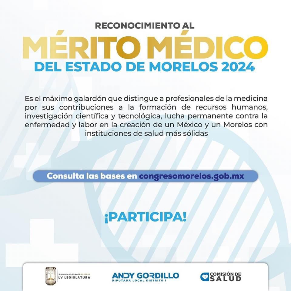 En este contexto, el Congreso del Estado de Morelos invita a las instituciones de salud de los sectores público, privado y social, así como a personas interesadas y asociaciones de profesionales de la medicina, a participar en el proceso de selección del Reconocimiento al Mérito Médico 2024. El proceso comenzará el 23 de septiembre de 2024 y finalizará el 4 de octubre del mismo año.