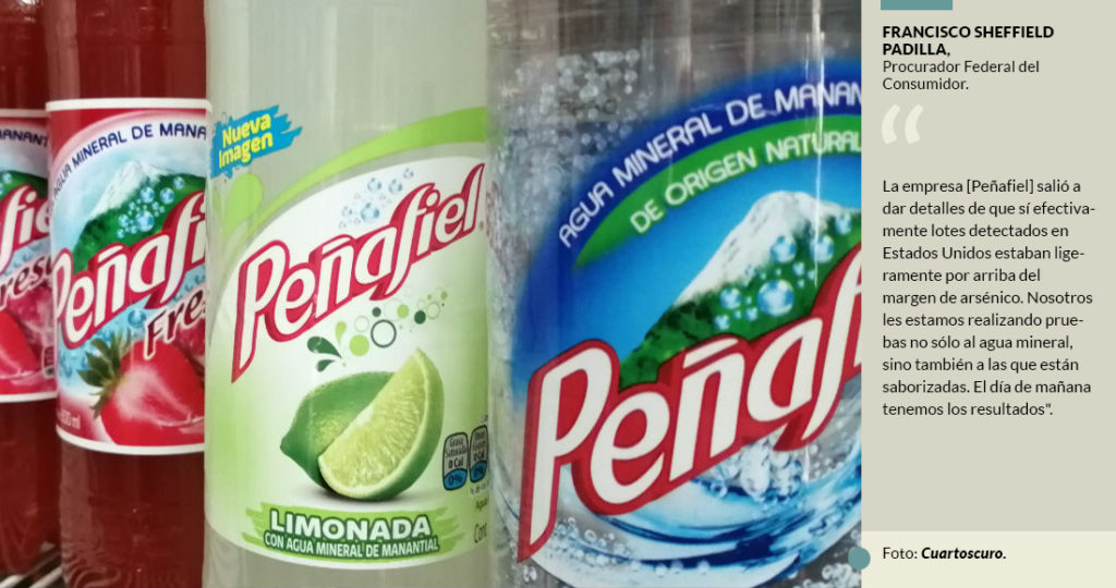 “En relación a Peñafiel, comentarles que la empresa salió públicamente a dar detalles de que sí, efectivamente, lotes detectados en los Estados Unidos estaban por arriba del margen, ligeramente por arriba del margen permitido de arsénico y que estaba deteniendo la producción en dos de sus plantas del agua mineral, tienen varios productos en el mercado. Nosotros le estamos realizando pruebas, no sólo al agua mineral sino también a las que están saborizadas, y el día de mañana tenemos los resultados de las pruebas con referencia al arsénico”, informó Francisco Sheffield Padilla, Procurador Federal del Consumidor.
