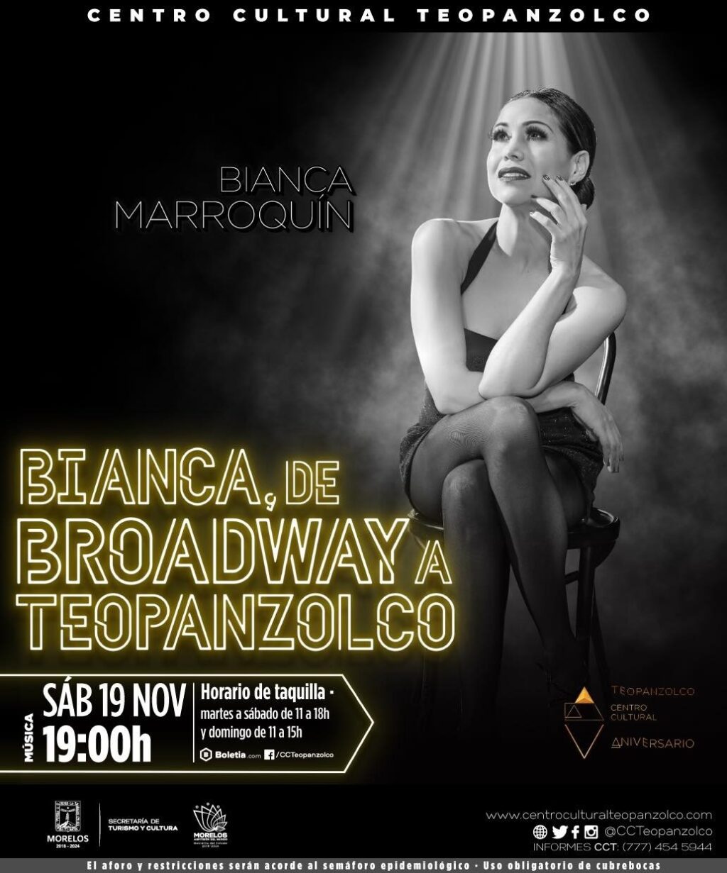 En el marco de la conmemoración de su quinto aniversario, el Centro Cultural Teopanzolco (CCT) presenta a la reconocida artista mexicana Bianca Marroquín, quien llega al escenario morelense, tras años de grandes triunfos en teatro en el extranjero, con un recorrido por su carrera en México y Broadway con los temas más emblemáticos de sus musicales como Chicago, Mary Poppins, La Novicia Rebelde y Rent, acompañada de prestigiados músicos morelenses.