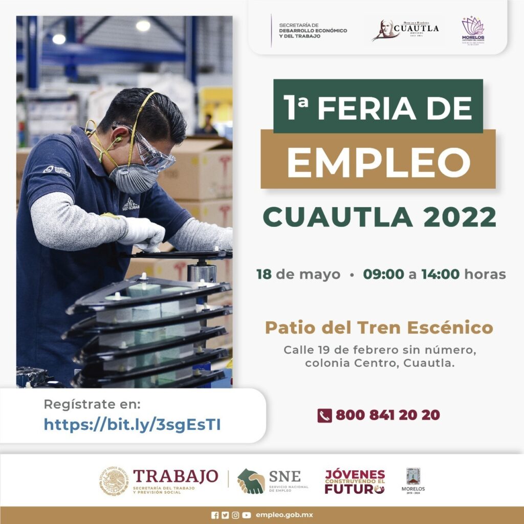 La feria de empleo se llevará a cabo el próximo miércoles 18 de mayo del presente año, en un horario de 09:00 a 14:00 horas en las instalaciones del Tren Escénico de Cuautla, ubicado en calle 19 de febrero, sin número, en la colonia Centro.