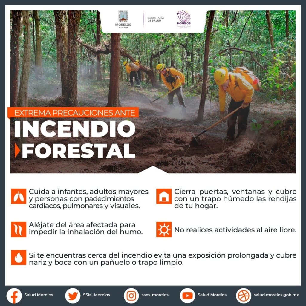 Servicios de Salud de Morelos (SSM) recomendó a la población que ante la presencia de humo derivado de incendios forestales, quemas agrícolas o urbanas, proteja su salud y atienda las indicaciones de las autoridades.