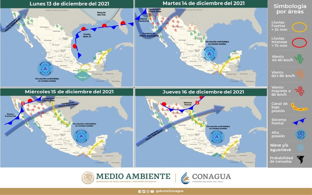 La Comisión Estatal del Agua (Ceagua) informa que para el periodo del 13 al 17 de diciembre se mantendrán condiciones atmosféricas muy similares sobre el territorio nacional, en relación al fin de semana, por lo que persistirán patrones de fuerte estabilidad con ambiente seco y mañanas frescas a frías.