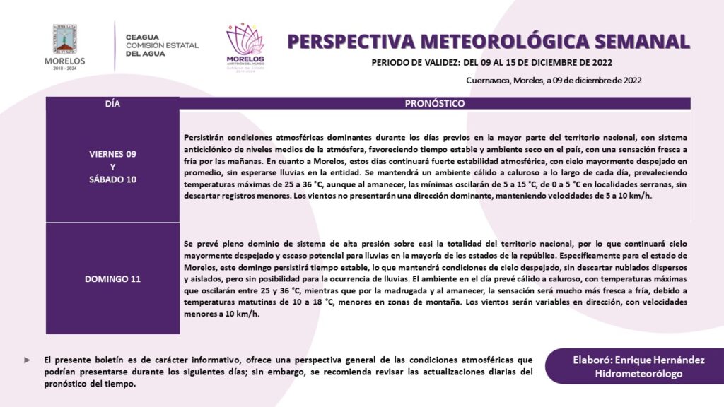 La Comisión Estatal del Agua (Ceagua) emite la perspectiva meteorológica referente a las condiciones que prevalecerán en el segundo fin de semana del mes de diciembre, en el que se prevé tiempo estable, con cielo mayormente despejado.