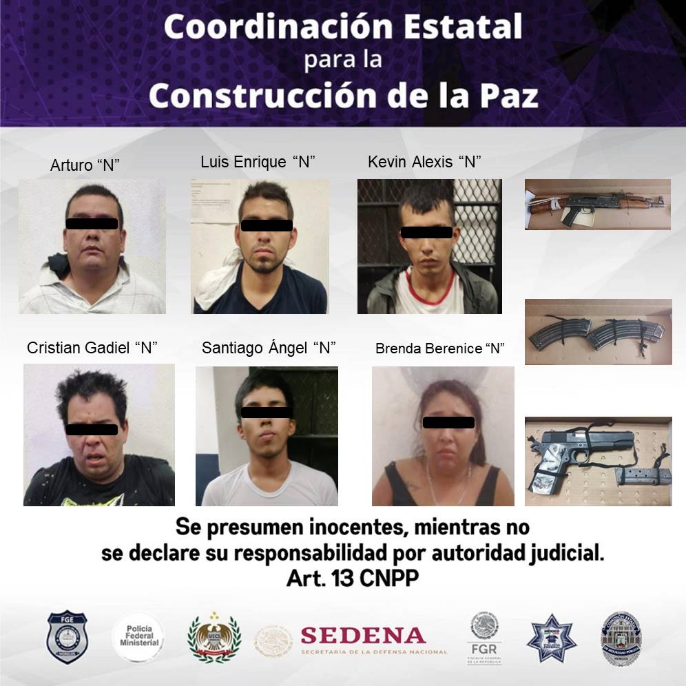 Por estos hechos fueron detenidos Arturo “N”, de 38 años de edad; Luis Enrique “N”, de 27 años de edad; Kevin Alexis “N”, de 32 años de edad; Cristian “N”, de 32 años de edad; Santiago Ángel “N”, de 18 años de edad; y Brenda Berenice “N”, de 24 años de edad; quienes fueron presentados ante el agente del Ministerio Público para que determine su situación jurídica.