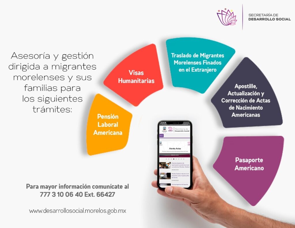 En el marco del Día del Migrante Morelense y su Familia, la Secretaría de Desarrollo Social (Sedeso) informa que durante el 2021 ha brindado asesoría a 483 morelenses que han solicitado la gestión en trámites como: apostille, actualización y corrección de actas de nacimiento americanas, pasaporte americano, pensión laboral americana, visa humanitaria y, visas para adultos mayores a través del Programa Corazón de Plata.