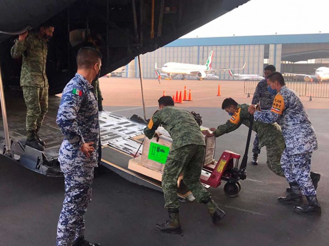 Mientras tanto, elementos del Ejército Mexicano clasifican la carga en el Almacén Covid instalado en el hangar del Sexto Grupo Aéreo de la Fuerza Aérea Mexicana (FAM), y otros la colocan en una aeronave para el traslado de este jueves.