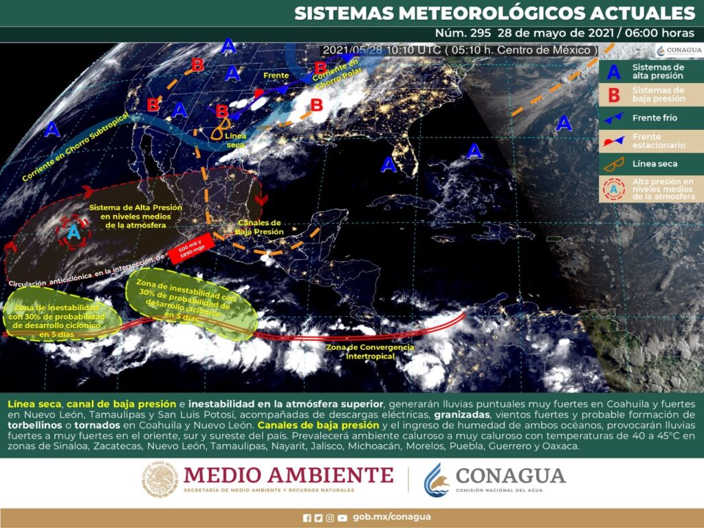 El domingo prevalecerán condiciones inestables, con cielo medio nublado a nublado, principalmente por la tarde y noche, así como potencial para la generación de tormentas dispersas y lluvias de 5.1 a 25 mm, con puntuales superiores en la porción sur del estado.