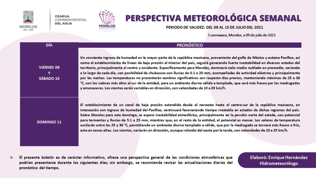 La Comisión Estatal del Agua (Ceagua) informa que para el segundo fin de semana del mes de julio habrá tiempo variable, cielo medio nublado con posibilidad de chubascos de ligeros a moderados, especialmente por las tardes.