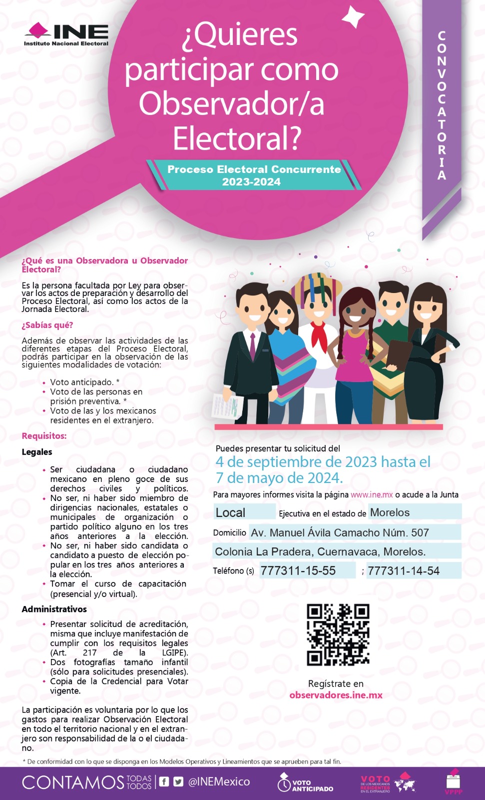 Mañana 21 de septiembre termina el plazo para que las y los ciudadanos interesadas en participar como candidatos independientes a una senaduría expresen sus intenciones ante las Juntas Locales Ejecutivas del Instituto Nacional Electoral (INE) distribuidas en todo el país, así lo dio a conocer el vocal secretario del INE en Morelos, Ignacio Mejía López, precisó la manifestación no intención no es su registro puesto que para poder hacerlo deberán cumplir con una serie de requisitos entre los que destacan constituir una asociación civil, reunir el dos por ciento de la ciudadanía inscrita en la lista nominal de Morelos.