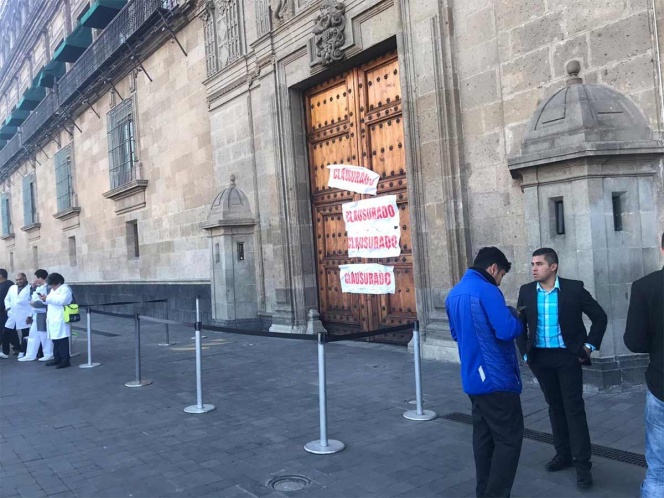 Padres de familia con niños que padecen cáncer “clausuraron” de manera simbólica la puerta principal de Palacio Nacional a manera de protesta por el desabasto de medicamentos en los institutos del sector salud. En el lugar también se encontraron pacientes, médicos y prestadores de servicio que denunciaron las deficiencias a las cuales se han enfrentado últimamente.