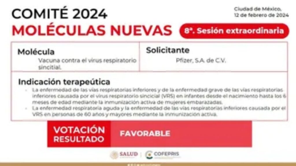 La Comisión Federal para la Protección contra Riesgos Sanitarios (Cofepris) ha aprobado la vacuna contra el Virus Sincitial Respiratorio (VSR) desarrollada por el laboratorio Pfizer. Esta aprobación se realizó durante la octava sesión extraordinaria del Comité de Moléculas Nuevas (CMN) de la Cofepris.