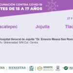 El lunes 27 y martes 28 de diciembre se aplicará segunda dosis de 15 a 17 años, y segunda dosis a la población rezagada de 18 a 29 años, en el Hospital General de Jojutla “Dr. Ernesto Meana San Román”, ubicado en avenida Universidad, sin número, colonia Centro; esta convocatoria es también para los municipios de Zacatepec y Tlaquiltenango.