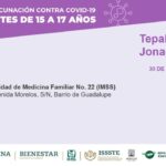 En los municipios de Tepalcingo y Jonacatepec, el 30 de diciembre se inmunizarán con segunda dosis la población de 15 a 17 años en la Unidad de Medicina Familiar, número 22 del IMSS, en avenida Morelos, sin número, Barrio de Guadalupe.