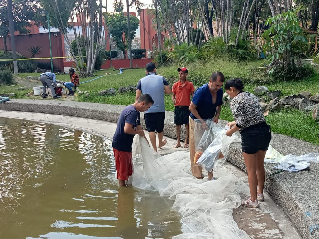• Se está llevando a cabo el retiro de los peces (Carpa koi y Tilapia) con red para minimizar la perdida de las especies, las cuales están siendo llevadas a un criadero para su rehabilitación y posteriormente se volverán a introducir nuevos especímenes jóvenes.