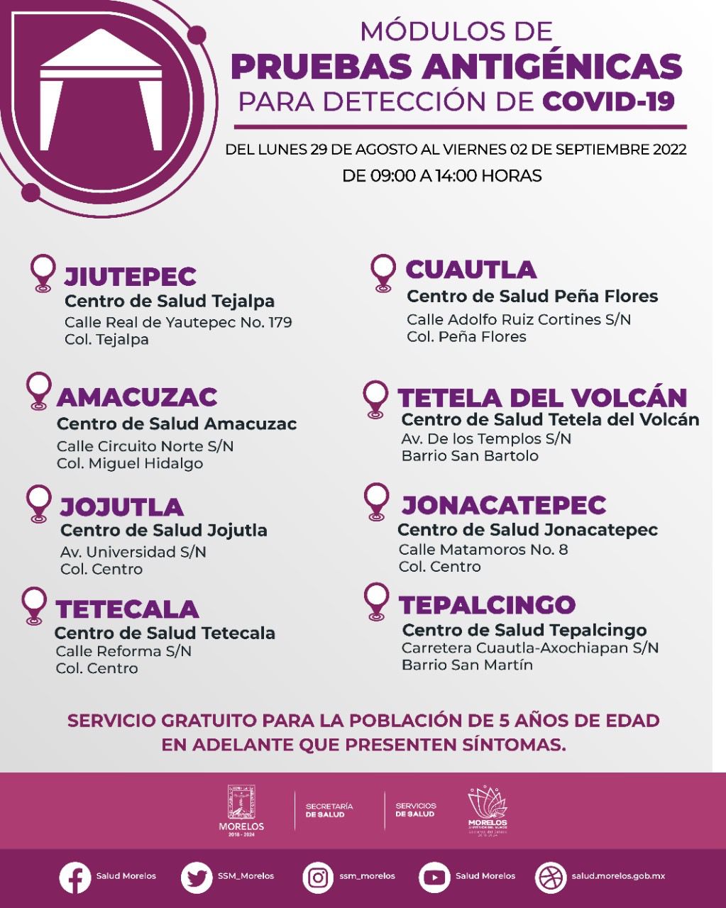 El Gobierno estatal, a través de la Secretaría de Salud y Servicios de Salud de Morelos (SSM), dio a conocer que, del lunes 29 de agosto al viernes 02 de septiembre de 2022, estarán disponibles las pruebas antigénicas gratuitas para detectar COVID-19 en unidades médicas.