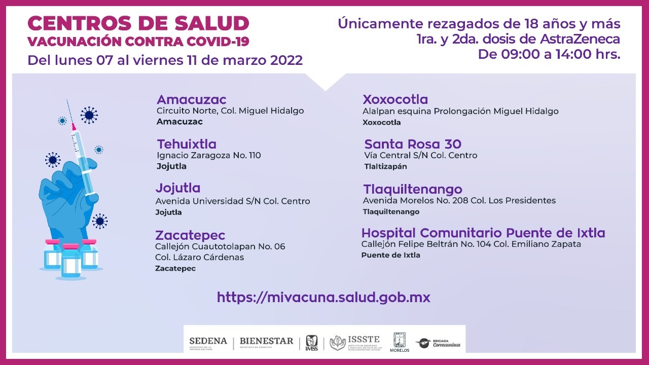 En la Jurisdicción Sanitaria I, la inmunización estará disponible en los centros de salud de Tres Marías, avenida Zempoala, sin número en Huitzilac; en Tepoztlán, en la calle Ignacio Zaragoza, número 15, colonia Centro; y en Alpuyeca, calle Matamoros, número 31, colonia Centro en Xochitepec.