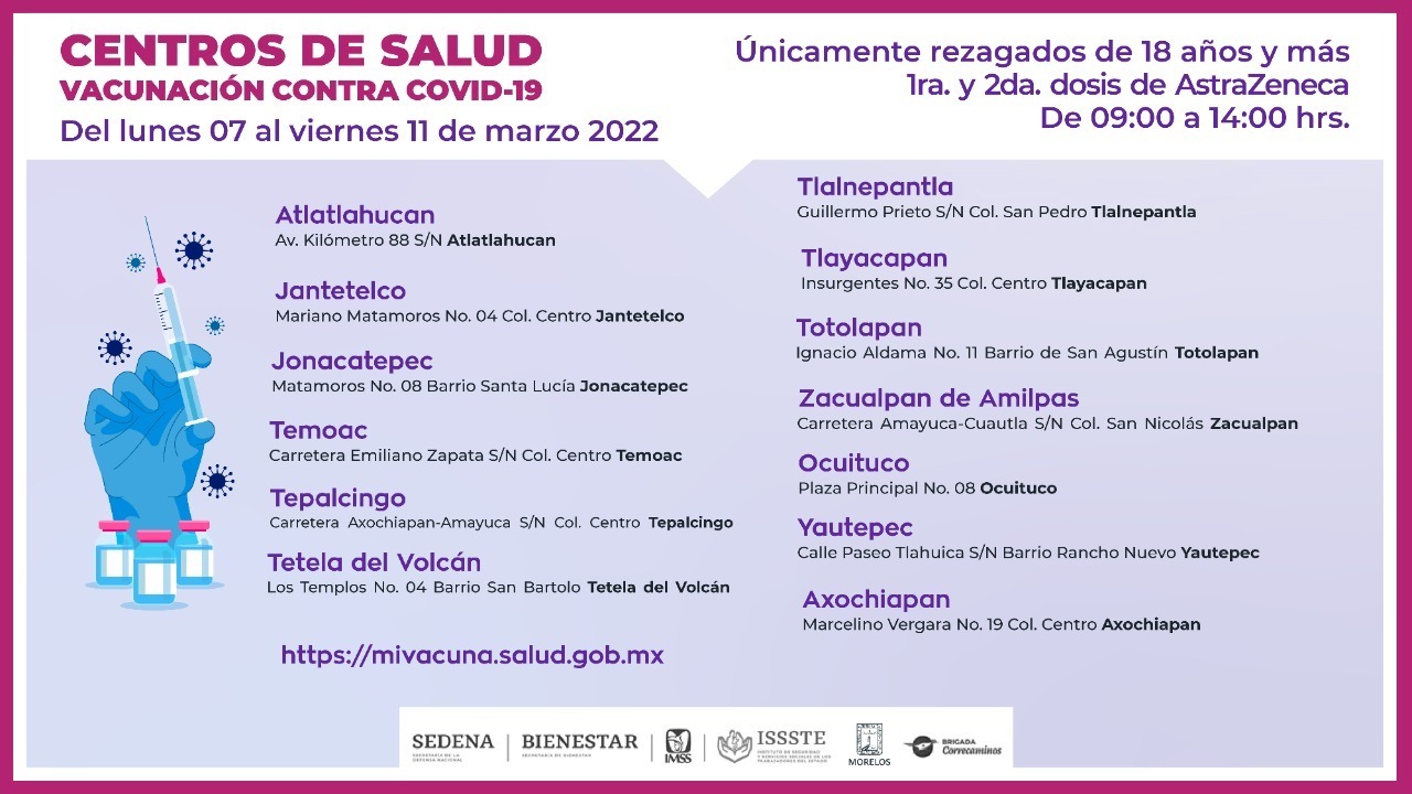 Además, en Tepalcingo, en la carretera Axochiapan-Amayuca, sin número, colonia Centro; Tetela del Volcán, en calle Los Templos, número 04, Barrio San Bartolo; Tlalnepantla, en Guillermo Prieto, sin número, colonia San Pedro; y en Tlayacapan, el centro médico que se ubica en calle Insurgentes, número 35, colonia Centro.