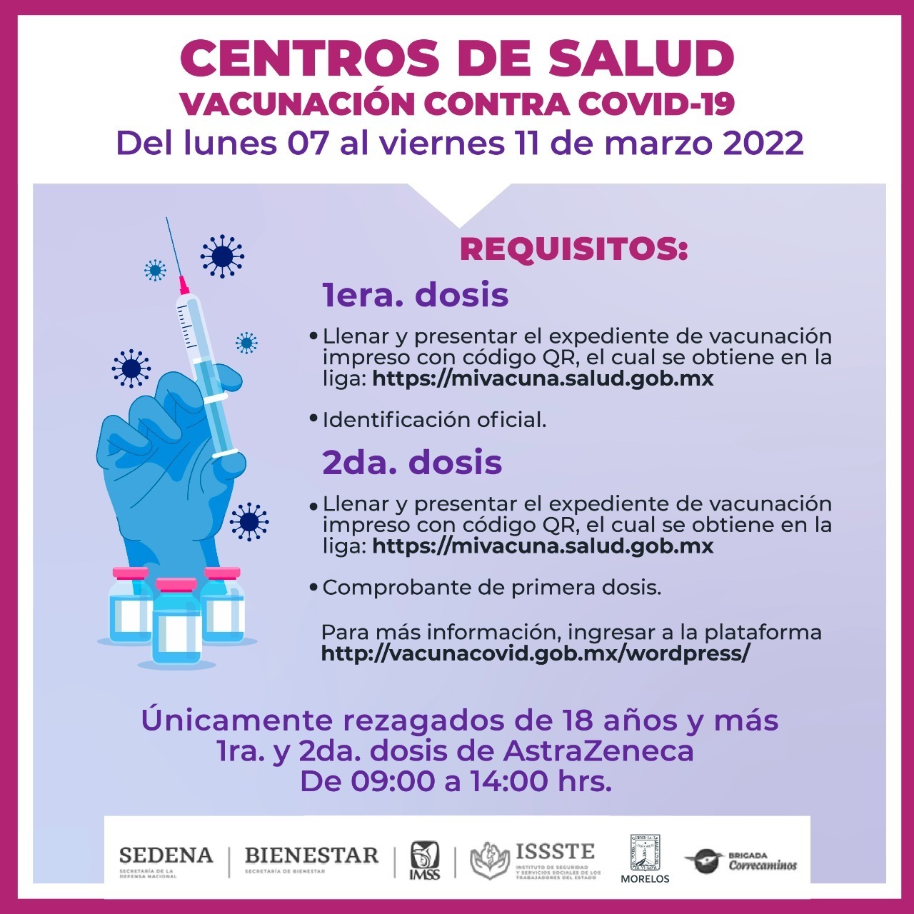 La brigada Correcaminos, a cargo del Instituto Mexicano del Seguro Social (IMSS) Morelos y de la Delegación Federal de los Programas de Bienestar en Morelos, e integrada por la Secretaría de la Defensa Nacional (Sedena), Guardia Nacional, Instituto de Seguridad y Servicios Sociales de los Trabajadores del Estado (ISSSTE), Secretaría de Salud y SSM, refirió que este plan piloto se lleva a cabo de manera simultánea con las jornadas de refuerzo en los macro módulos