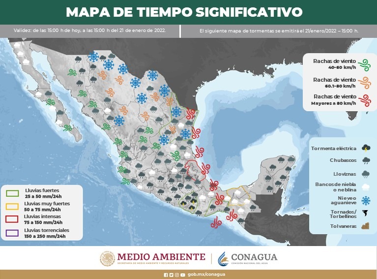 El día de hoy dominará condiciones de tiempo variable, con presencia de nublados de niveles altos de la atmósfera y, aunque la probabilidad es baja, no se descartan lluvias ligeras de 0.1 a 5 mm, principalmente en la parte norte de la entidad, además de posibles neblinas matutinas en zonas serranas. Los valores de temperatura, con máximas en un rango de 24 a 36 °C, mantendrán un ambiente diurno cálido a templado, el cual se tornará frío al amanecer, cuando las mínimas estén por debajo de 15 °C en la mayoría de los municipios, menores a 5 °C en localidades de montaña. Los vientos serán del norte al atardecer, con velocidades de 10 a 20 km/h.