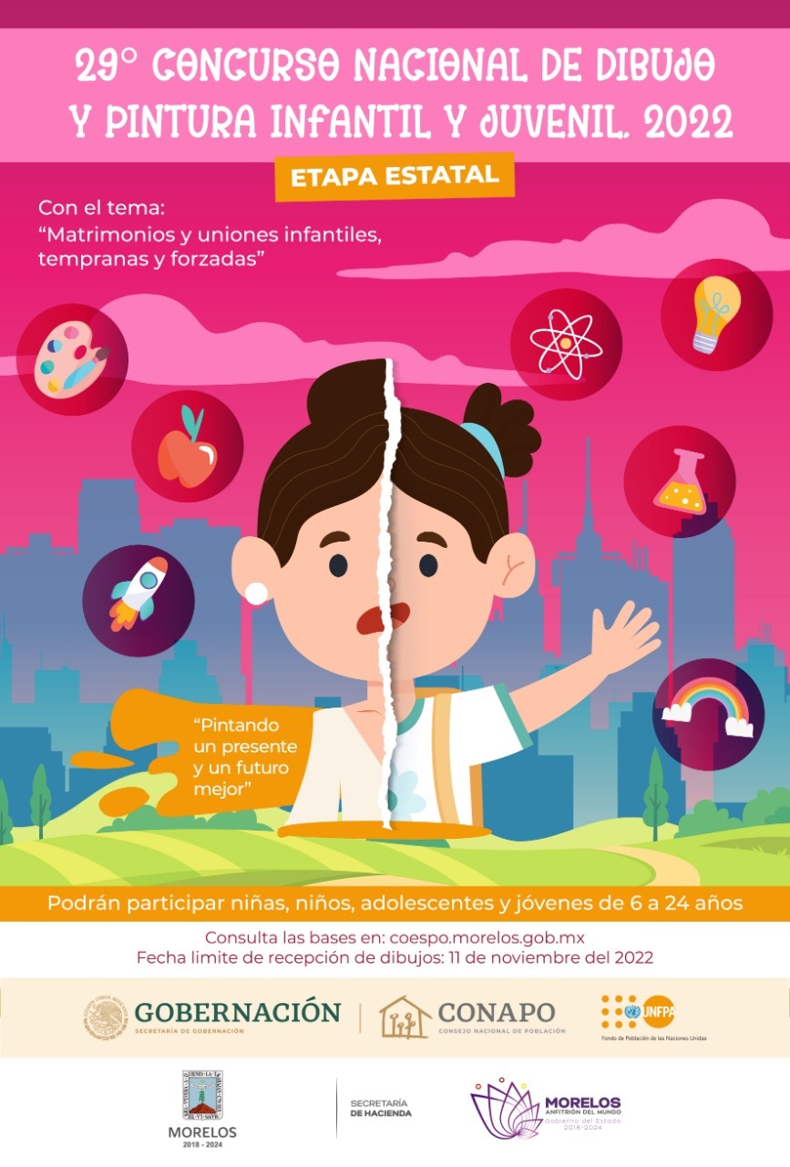 La Secretaría de Hacienda, a través de la Unidad de Planeación, hace un llamado a niñas, niños, adolescentes y jóvenes de seis a 24 años de edad, residentes en Morelos, a participar en el 29° Concurso Nacional de Dibujo y Pintura Infantil y Juvenil 2022, con el tema: “Matrimonios y uniones infantiles, tempranas y forzadas. Pintando un presente y un futuro mejor”.