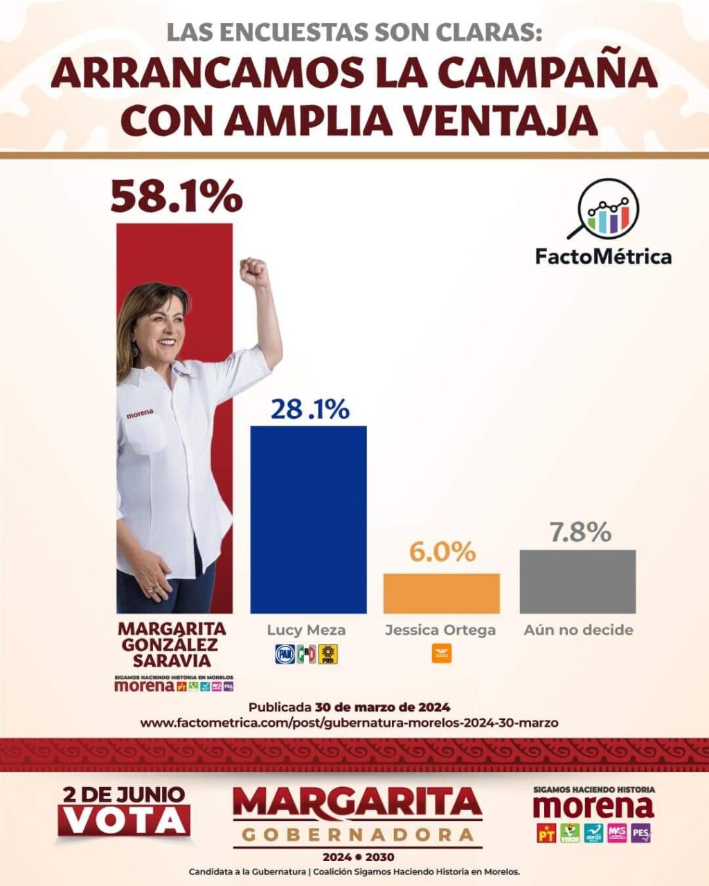 En su más reciente estudio demoscópico, FactoMétrica arrojó que la candidata de la coalición Morena, PT y Verde, Margarita González Saravia contó con el 58 por ciento de la intención del voto; mientras la representante de la alianza PRI, PAN y PRD, Lucía Meza Guzmán obtuvo 28.1 por ciento de los posibles votos.