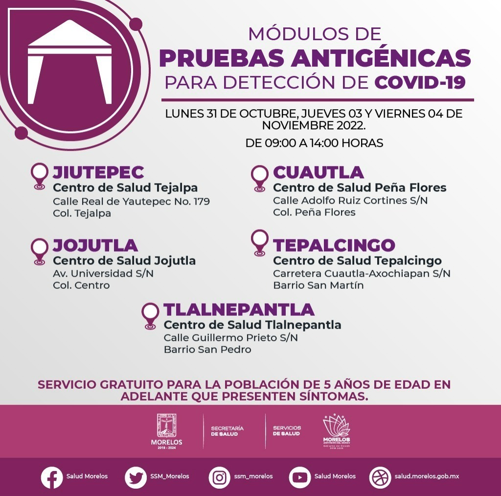 La Secretaría de Salud, a través de Servicios de Salud de Morelos (SSM), informó que las pruebas antigénicas para detección de COVID-19 estarán disponibles en centros de salud de los municipios de Jiutepec, Jojutla, Cuautla, Tepalcingo y Tlalnepantla.