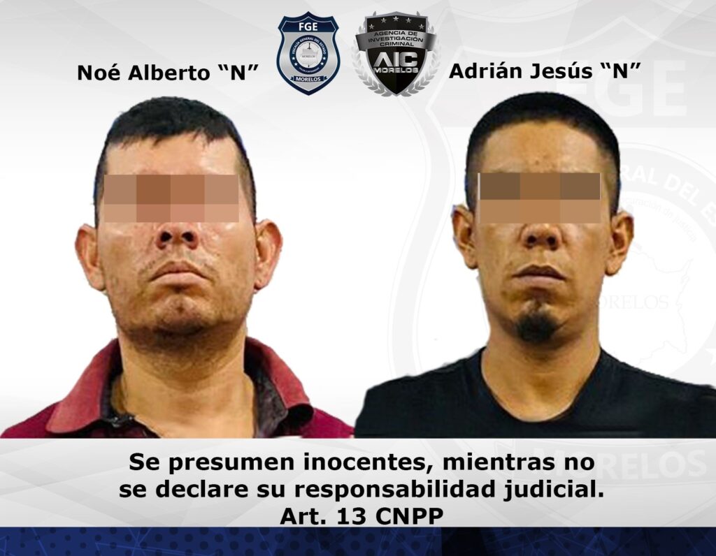 Elementos de la AIC lograron el aseguramiento de Adrián Jesús “N”, alias “La Zorra”, de 28 años de edad, vecino de la colonia Centro del poblado de Santa Rosa Treinta, perteneciente a Tlaltizapán; y Noé Alberto “N”, apodado “El Vacuni”, de 32 años, vecino del campo “La Matanza”, del propio ejido de Santa Rosa 30.