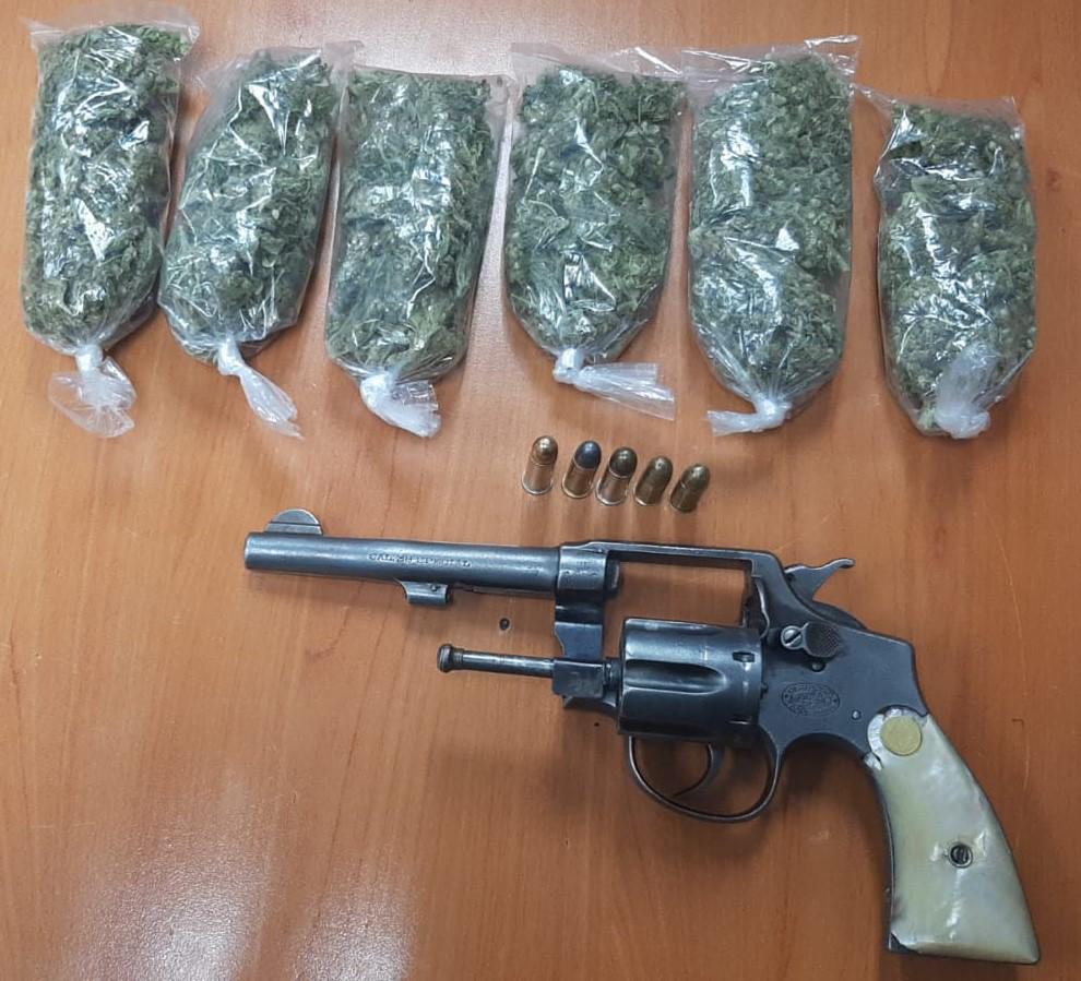 Por lo que los elementos, les solicitan a las personas bajen del vehículo para hacerles una inspección, y al realizarla al masculino, se le encuentran seis bolsas de plástico transparentes, las cuales en su interior contienen vegetal verde con características similares a la de la droga conocida como la marihuana y al realizar la inspección a la femenina, en su bolsa de mano, se le encuentra una arma de fuego tipo revolver, calibre 38 especial, dos cartuchos útiles calibre 38 súper y tres cartuchos útiles calibre 38 especial.